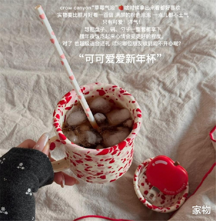 其实更像是彩色水磨石风格的水杯,但形容成草莓起泡的感觉倒也没有丝毫不妥,上面的红色点点真的很好看,盖子同时也能当小碟子,放些零食边饮边吃,想想就觉得很惬意有没有~